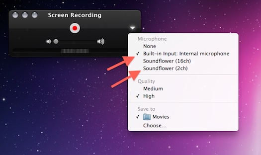 The QuickTime Screen recording window has been opened now. Here you have list of options. Simply click record to use the built in Mic, or move your cursor below to select an audio input.