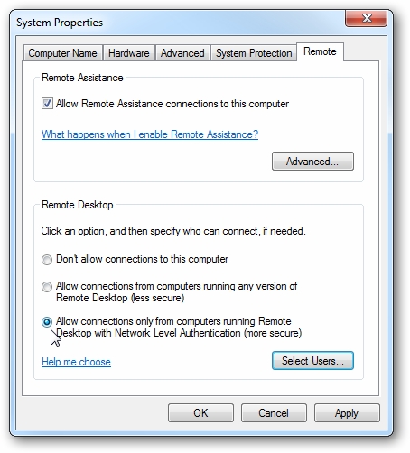 Click on the Remote tab, which is located on the bottom right corner of your window and then select Allow connections only from computers running Remote Desktop with Network Level Authentication (more secure).