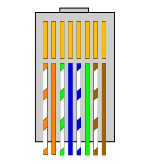 From left to right, arrange the wires in a CAT5 cable following the sequence: white/orange, orange, white/green, blue, white/blue, green, and white/brown, brown. Keeping the wires in this sequence, insert them in RJ-45 connector with gold contacts on the connector facing towards you. Crimp the connector with a pair of RJ-45 crimpers. Follow the same steps to install another RJ-45 connector at the other end of the CAT5 cable.