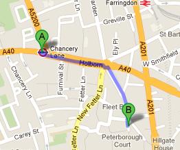 From the closest underground Chancery Lane, you will have to walk for 8 minutes to cover the distance of 0.4 mile. After coming out of the station, head towards southeast direction on Grays Inn Rd/A5200. You will have to pass a roundabout after covering 0.2 miles distance and then head onto Shoe Ln where your destination is located. For further information, take a look at the route map through this link.