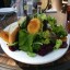 Pour one to two tablespoon cooking oil into a frying pan and heat it over medium heat. Place the peeled potato wedges it in and fry them until lightly brown and crispy. Drain the fried potato wedges until oil free and place them on one side of the salad on the platter.