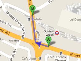 About 2 minutes walking distance from the transit station, L'Artista restaurant is located. In order to cover the 0.1 mile distance, you will have to head North and continue commencing on Finchley Road/A502. After wrapping up about 207 feet distance, take a left turn and you will reach your destination by covering 436 feet distance. Directions from Golders Green Station to L’Artista will further assist you.
