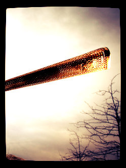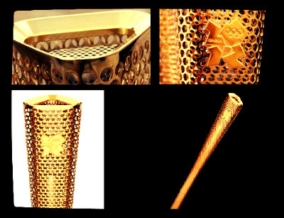 With the material of aluminum, a very light weight 800 meter long, torch is made for 2012 Olympics London. The triangular shaped torch is portraying Olympic Movement visions, which are education, culture and sports. The torch is painted gold which symbolizes brightness and warmth, besides that it also has 8,000 perforated small circles.