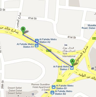 Al Fahidi Metro Station 1 is 260 metre away from Mama's Restaurant. Patrons can easily bridge this gap on foot in about 4 minutes, if they head northwest on Kalid Bin Al Waleed Road/D 79 towards Al Mankhool Road/D 90. Directions from Al Fahidi Metro Station 1 to Mama's Restaurant.