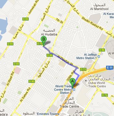 World Trade Centre Metro Station 2 is about 1.9 kilometres away from Mini Chinese Restaurant. This makes it a walking journey of 24 minutes roughly. If a patron heads in north direction from this metro station and then turns slightly left towards 308th Road. After that, the patron should turn left towards 308th Rd and then make a right turn onto 308th Road from where he or she needs to take a sharp left turn towards Al Diyafah Street/D 73 in order to continue straight onto Al Diyafah Street/D 73. Later, the patron will go through one roundabout and soon find the destination a few meters away. Directions from World Trade Centre Metro Station 2 to Mini Chinese Restaurant.