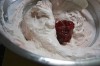 Take about 6 to 8 fresh and properly washed strawberries and cut them up nicely into equal pieces. Fold the pieces into the whipped-strawberry mixture.