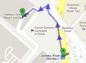 The nearest bus stop from the Nautica 1992 The Habtoor Grand Beach Resort & Spa Dubai is Jumeira, Royal Meridian 1. The route that makes a stop here is Ibn Batutta Metro Station 1. In order to cover the 350 minutes distance between the two locations by walk, it will take approximately 5 minutes. After getting off the bus, head in the north direction on Jumeruah Beach Rd and then continue your walk on the Al Sufouh Rd/D 94. After covering 47 meters distance take a slight left turn, 84 meters further you will have to take another left turn. The last left turn will help you in reaching at your destination. For a detail view of the map, check the Pedestrian Route.