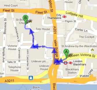 London Blackfriars tube station is about 0.3 miles away from the Office of Fair Trading (OFT) and a patron can cover this gap on foot easily in 6 minutes. All patron should do is head out west on Queen Victoria Street towards Victoria Embakment/A201 after getting out of the London Blackfriars tube station and then, turn right onto Victoria Embakment/A201. This will lead him or her to a left turn onto Victoria Embakment from where patron should take a sharp right turn onto New Bridge Street/A201 and then, turn left onto Tudor Street. This course will guide the patron to a right turn onto Dorset Rise from where commuter will turn slight right to stay on Dorset Rise and then finally take the last turn on the left to Salisbury Square to locate the destination on the left. View Map