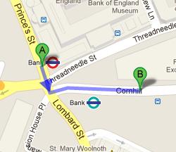 Bank Station Cornhill (Stop E) is 13 seconds walk from the Bank of England, as the distance between them is about 59 feet. So if a person heads west on Cornhill towards Lombard Street, he or she will be able to find the destination soon after covering 59 feet distance. Bus numbers that have stops at this bus stop are 25, 710, N550, N551, 007, 010, 741, 741D and 742. Directions from Bank Station Cornhill (Stop E) to the Bank of England.