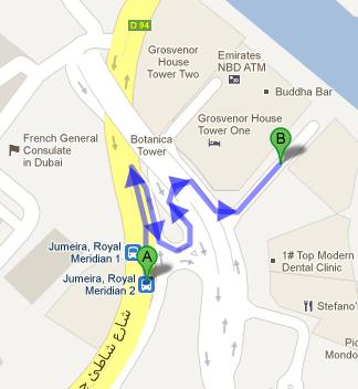 Bus numbers 8 and F37 serve Jumeira, Royal Meridian 2 – Dubai bus stop that is just 450 meters away from the Ottomans Restaurant in Grosvenor House. This makes it a walking journey of about 5 minutes, if a bus user heads in the north direction on Jumeirah Beach Road from this bus station, then take a sharp right turn, before making a slight turn on the left side. After which bus user will make right turn twice, one after the other, before making the final turn on the left side in order to get to the destination that is located on the left side few meters away. View map for directions.