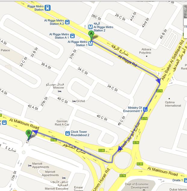 Later at the roundabout, commuters need to take the second exit onto Al Maktoum Road/D 89, from where they will turn left onto 13th Street and destination will be not too distant from there onwards. Directions from Al Rigga Metro Station 1 to Ozone Restaurant.