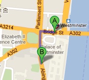 Abingdon Street (M) is the nearest bus stop from the Palace of Westminster. Moreover, bus numbers 3, 87, N3 and N87 have stops at this bus stop, so bus users can easily get to Abingdon Street (M). The gap between Abingdon Street (M) and the Palace of Westminster is close to 453 ft, which makes it a walking journey of 2 minutes approximately. If the bus user heads out in the north course on Abingdon Street/A3212 towards Parliament Square/A302, he/she will find the palace on the left side. Directions from Abingdon Street (M) to the Palace of Westminster.