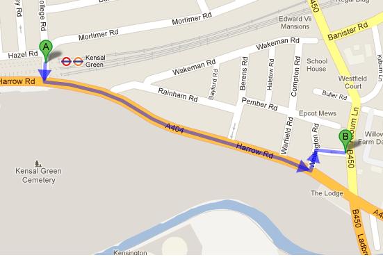 The nearby Kensal Green tube station is 0.5 miles away from the restaurant. From this tube station move southward on Mortimer Rd/B451. Now take the left turn onto Harrow Rd/A404 and then turn left onto Wellington Rd. From there, you will have to turn right onto Regent St and the restaurant will be on your left side. To have a look at a detailed route map, click walking directions.