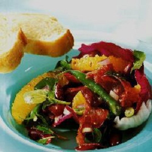 Nothing better than a bowl of fresh veggie salad that is full of nutrients like this one. The Radicchio and Beans Cups salad takes care of your vitamin, minerals and fiber needs. It can serve as an exciting fresh course and if you couple it with bread, it will do well as a light lunch or afternoon meal when your tummy starts nagging with a craving for something appetizing. The salad has a variety of ingredients apart from the main ones like salami, orange and onions. The end product is quite interesting and delicious. Follow our step by step guide and learn to make a wonderful meal.