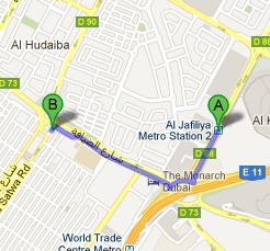 Al Jafiliya Metro Station 1 is 1.8 kilometres far from the Ravi Restaurant in Satwa. This makes it a walking journey of about 22 minutes. All commuters need to do is to head in the southwest direction on شارع الشيخ خليفة بن زايد‎/D 88 and at the roundabout, take the second exit in order to continue straight onto شارع الضيافة‎/D 73. After that commuters should make a slight left turn towards Al Dhiyafa Road and then continue straight onto Al Dhiyafa Road, where destination is situated on the left side.