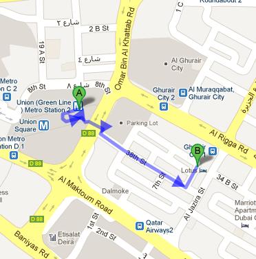 Union Metro Station 1 is 600 meters away and 8 minutes walk from the Rendezvous Nightclub at Lotus Hotel in Dowbtown Deira, Dubai. Commuters of Union Metro Station 1 can cover this gap in 8 minutes, if they follow these directions: