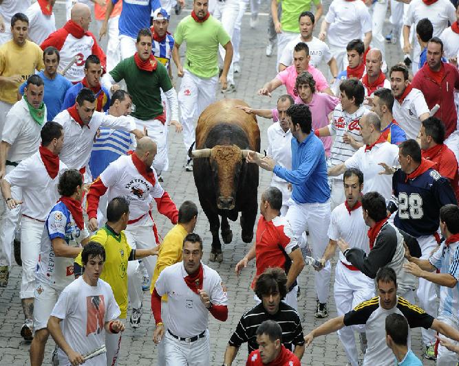 At 8:00 pm the first firecracker is released, which means the bulls are on the loose. People have to run through 825 meter long narrow street all the way to the Pamplona’s bullring. When people hear the sound of the third cracker it means the last bull has been released. Shepherded wearing green T-shirts holding long poles are also involved in the race in order to guide the bulls and oxes. The bulls are in the arena, this is indicating by the fourth cracker and the fifth cracker is released when the bulls are in their bullpens. Then cows are released in the arena which tosses the participants.