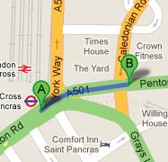 Pentonville, Kings Cross Caledonian Road (Stop X) is the nearest bus stop with buses 30,73,205,214,476 and N73 from Scala nightclub, as the gap between these two points is close to 79 ft and by walk a person can cover this distance in about 18 seconds. All the bus user needs to do after arriving at this bus stop is head west on Pentonville Road/A501 towards King's Cross Bridge in order to reach Scala nightclub. Directions from Pentonville, Kings Cross Caledonian Road (Stop X) to Scala Nightclub.