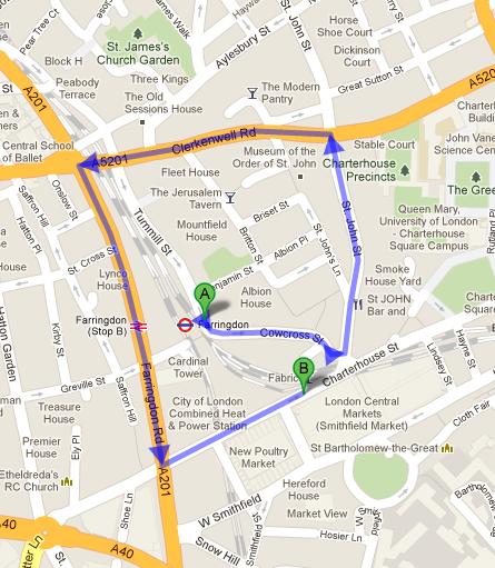 Farringdom is the nearest tube station to the famous eatery. Once you get off at the platform, you can drive to the restaurant. You will first need to head south on Turnmill Street which will change into Cowcross Street. You will then make a left on St. John Street and then another left on Clerkenwell Road. Take a left on Farringdon Street and head down to Charterhouse Street and make a left. The restaurant will be on your left hand side. View Map.