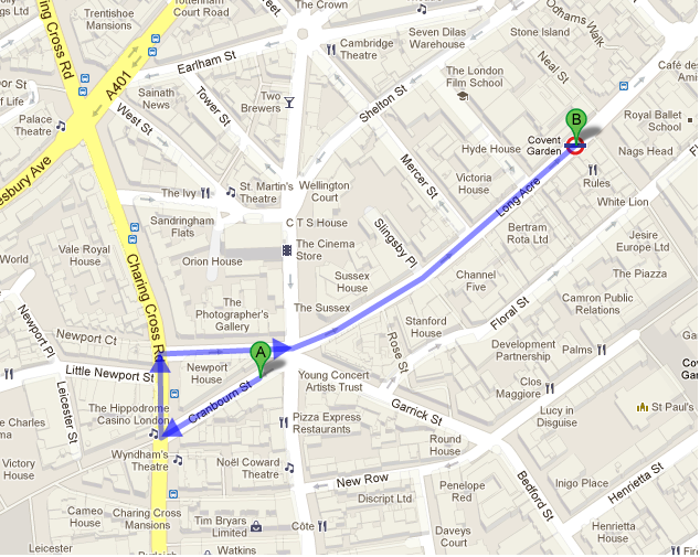 Spaghetti House head office is just 0.2 miles away from the Covent Garden tube station and a 3 minutes walk is required. In order to reach there you have to head northwest toward Long Acre/B402 then turn left onto Long Acre/B402, turn left again onto St. Martin's Ln/B404 and finally after turning right onto Cranbourn St/B402, you will reach Spaghetti House office. If you are driving you have to travel and drive 0.3 miles, and in order to see the driving instructions follow the Link!