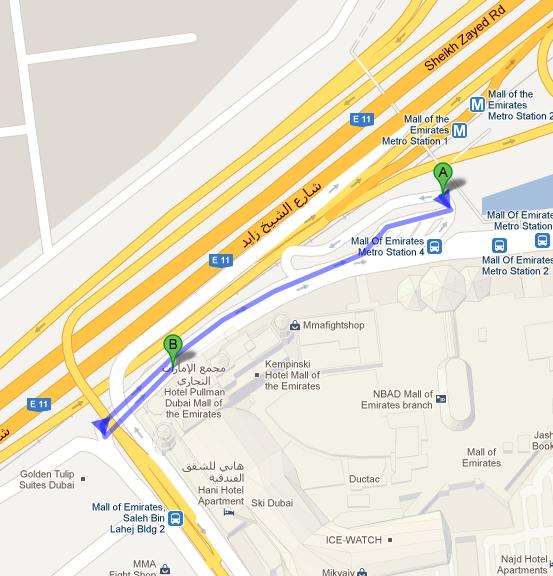 Mall of the Emirates Metro Station 2 is the nearest of all metro stations to Sushi Folie Restaurant at Holiday Inn Hotel. It will take the patrons about 7 minutes to cover the 600 metre distance between these two points on foot. If they head in the southeast course from the Mall of the Emirates Metro Station 2, then turn right, after which take a sharp left turn. Soon they will be able to locate the destination on the right side. Directions from Mall of the Emirates Metro Station 2 to Sushi Folie Restaurant.