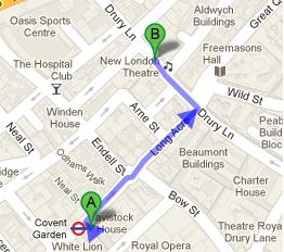 In order to travel by a bus, make sure you take route number 1, 242, N1 or N68 so that you can get dropped at the nearest bus stop, the Drury Lane (Stop S). In the southwest direction, head towards High Holborn/A40. After covering 148 feet distance take a left turn and continue your walk on Durry Ln. You will reach your destination after covering 0.1 mile distance. You can view the route by clicking this link.