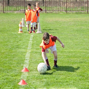 The term 'dribbling' in football means to move with the ball in control, the final aim being to score. Demonstrate basic dribbling to the children and show them how to protect the ball from opponent players by dodging and using the body and to not let the ball out of control. Dribbling gets better with practice when the children explore the arts of control, dodge and play.