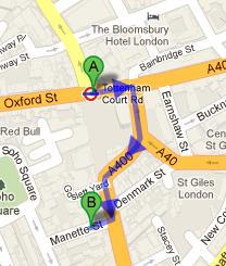Tottenham Court Road Tube Station is located about 0.2 miles away from The Borderline Nightclub and guests can easily cover this gap on foot in about 4 minutes. All they need to do is head east on New Oxford Street/A40 towards St. Giles High Street then turn right onto St. Giles High Street/A40 and continue to follow A40, which will turn into A400. From there guests should turn right onto Manette Street and the destination will be on their right side. Directions from Tottenham Court Road tube station to The Borderline Nightclub.