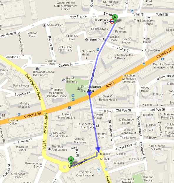 The nearest bus stop is Strutton Ground (Stop SJ). Bus numbering 507 reach this stop every day. Move north on Horseferry Rd/B323 and from the roundabout, take the 1st exit onto Greycoat Pl/B323 to reach the centre.