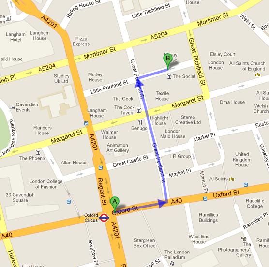 “Soho, Margaret Street Oxford Circus (Stop RD)” is the closest bus stop from the club and takes 2 minutes on foot to cover the 0.1 mile distance. Any of the buses numbering 88, 453, C2 or N18 would drop you at the bus stop. From there, head North on Regent St. and make a right turn on Little Protland St. The Social Club will appear on your right. View map
