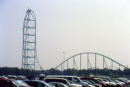Built in 1998, Oblivion is the world's first roller coaster ride with a longest vertical limit. It reaches up to 54 m high in the air at a speed of 109 km/h. Judging from the video, this ride is awful but tempting.