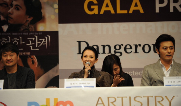 Chinese actress Zhang Ziyi (C) speaks while South Korean actor Jang Dong-gun (R) and movie director Hur Jin-ho (L) listen during a press conference on their movie Dangerous Liaisons at the 17th Busan International film festival (BIFF) in Busan on October 5, 2012. AFP PHOTO/TED ALJIBE (Photo credit should read TED ALJIBE/AFP/GettyImages)