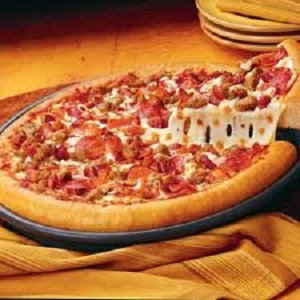 This deep dish pizza is cooked with pepperoni, onions, ham, olives, beef, mushrooms, sausage and abundance of cheese. The cheese, ham and beef add a lot of calories to it. two slices contain 46 gram of fat and 860 calories.
