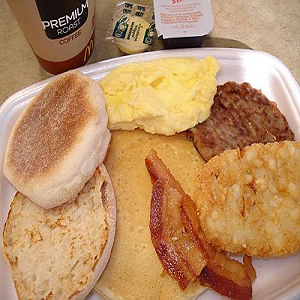 It has sausage, eggs, biscuits, hash browns and pancakes with syrup and margarine. These are all delicious items and make you drool. These make up a total of 1220 calories in the start of the day. It may be very delicious but your waist and hips will regret it later.