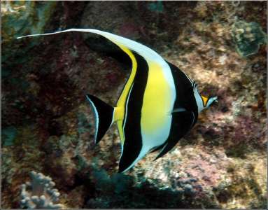 White, black, and yellow stripes on this fish make it very attractive. It is considered to be the 8th most beautiful fish in the world.