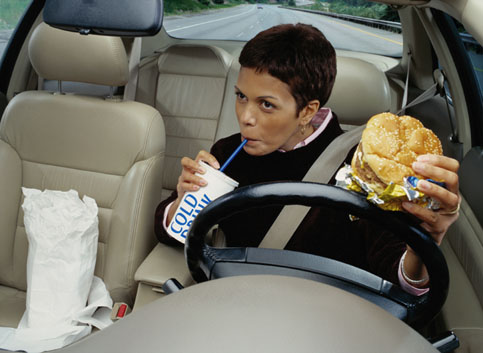 When you are driving, it is recommended that you do not perform any other task, like eating. You should only concentrate on the road and traffic around you, so that no accidents are caused.