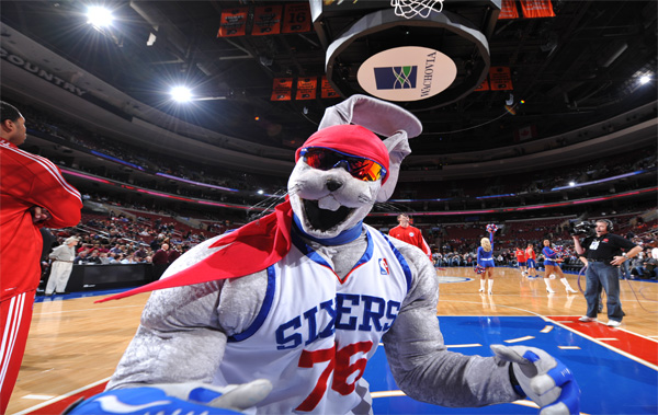 It is an odd looking rabbit that cheers for the Philadelphia 76ers basketball team. The mascot generally performs various tricks as well with the ball. It is said to be in the process of being replaced though.