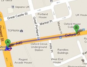 3 minutes walk is required to travel from Topshop station to Oxford Circus Station. In order to wrap up 0.3 mile distance between the two locations, you will have to walk in the North direction on the Regent St/A4201. Keep walking until Oxford St/A40 is reached, where the store is located. You can take a look at the route map from this link.