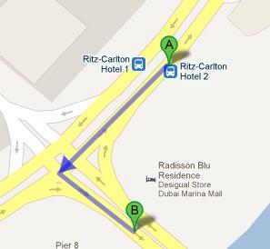 The routes that are allowed to make a stop at Ritz-Carlton Hotel 2 bus stop are route number 8 from Gold Souq Bus Station 2A and F37 from Mina Al Siyahi, Le Meridien Hotel 2 Marina Metro Station. For a detail view of the pedestrian path take a look at this link.