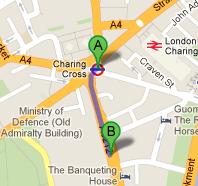Charing Cross tube station is about 0.2 miles away from the Palace of Whitehall, which makes it a walking journey of 3 minutes. If the patrons head northwest on Northumberland Avenue/A400 from the Charing Cross tube station then at the roundabout, take the second exit onto Whitehall/A3212 to find the destination in front of them. Directions from the Charing Cross tube station to the Palace of Whitehall.