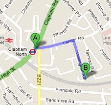 Clapham North tube station is 0.3 miles away from Willington Road Adventure Playground and by walk this distance can be covered in 6 minutes. If patrons head northeast on Clapham High Street/A3 towards Bedford Road/B221 from this tube station and then turn right onto Bedford Road/B221. Afterwards, patrons should slightly turn left onto Landor Road and then turn right onto Willington Road to find the destination on the left. Directions from Clapham North tube station to Fenwick Place (Stop P).