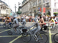 The World Naked Bike Ride in London starts at 3:30pm in the afternoon, after riders get together at the south-east corner of the Hyde Park. People on bicycles, skate boards and skates went through different streets of the British capital during this 9 mile journey. Different stalls are setup during this event and riders also help the cause by leafleting. In this way the participants of this rally register their protest against car culture and global dependence on oil.