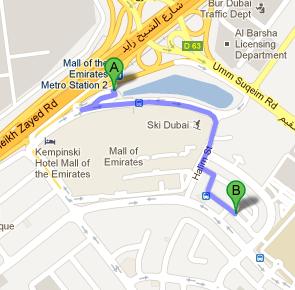 Mall of the Emirates Metro Station 1 is 1.3 kilometres away from the Wrap & Roll Haandi Restaurant, so pedestrians have to walk for about 16 minutes to cover this distance between the two sites. All they need to do is to head in the southeast course, then turn right and afterwards make a sharp left turn towards Halim Street in order to continue straight onto Halim Street. After that walkers should turn left and later make a right turn to find the destination on the left side.